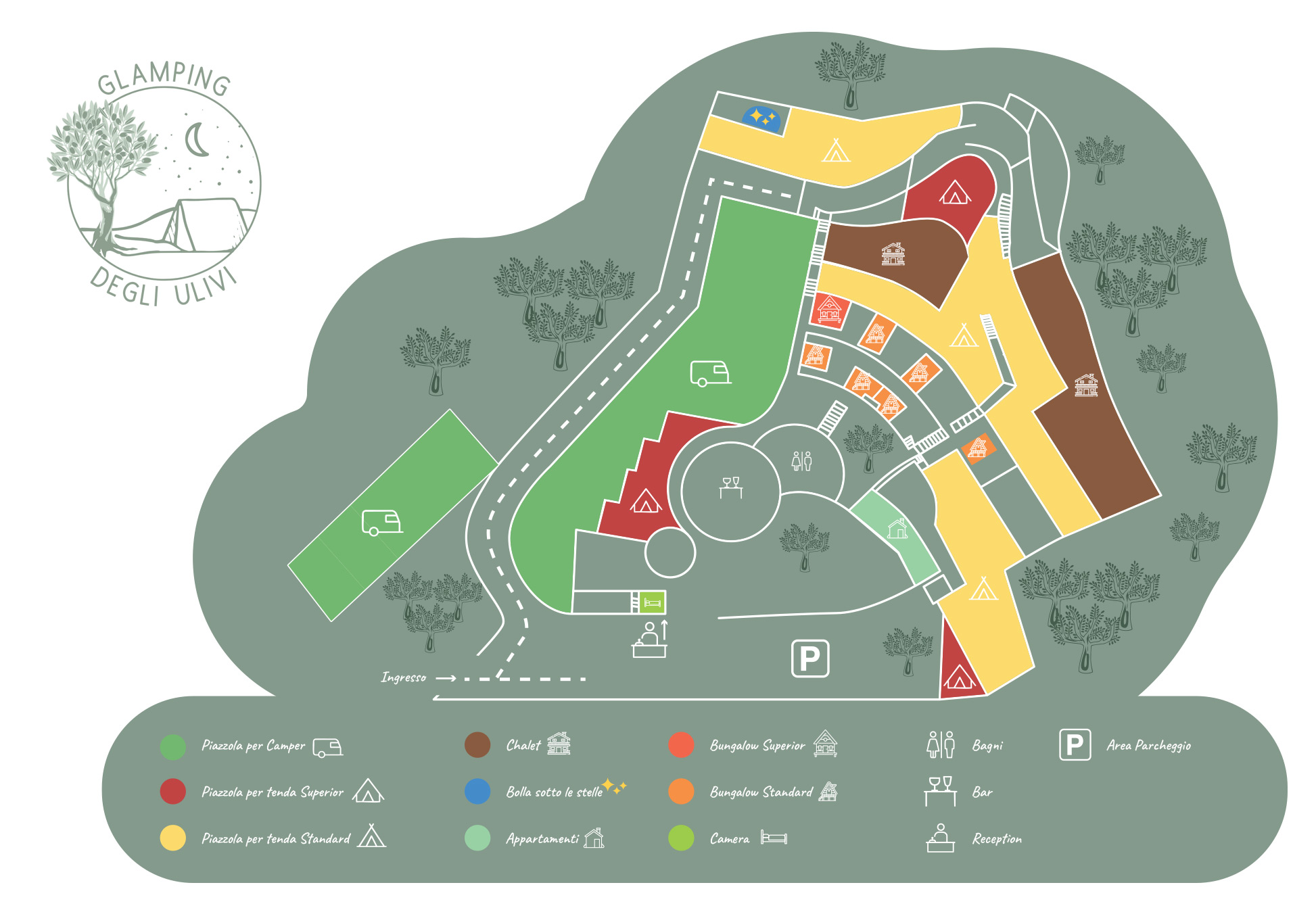 Per adattarsi a ogni vostra esigenza di viaggio, il Glamping degli Ulivi propone piazzole attrezzate per tende e camper, bungalow in legno recentemente rinnovati, chalet in legno con spazio esterno privato, confortevoli appartamenti in muratura e, per un’esperienza davvero speciale, la nostra bolla panoramica “Sotto le stelle”. Situata nella posizione più alta del Glamping, la bolla vi permetterà di dormire sotto un cielo stellato, immersi in una cornice suggestiva e unica.